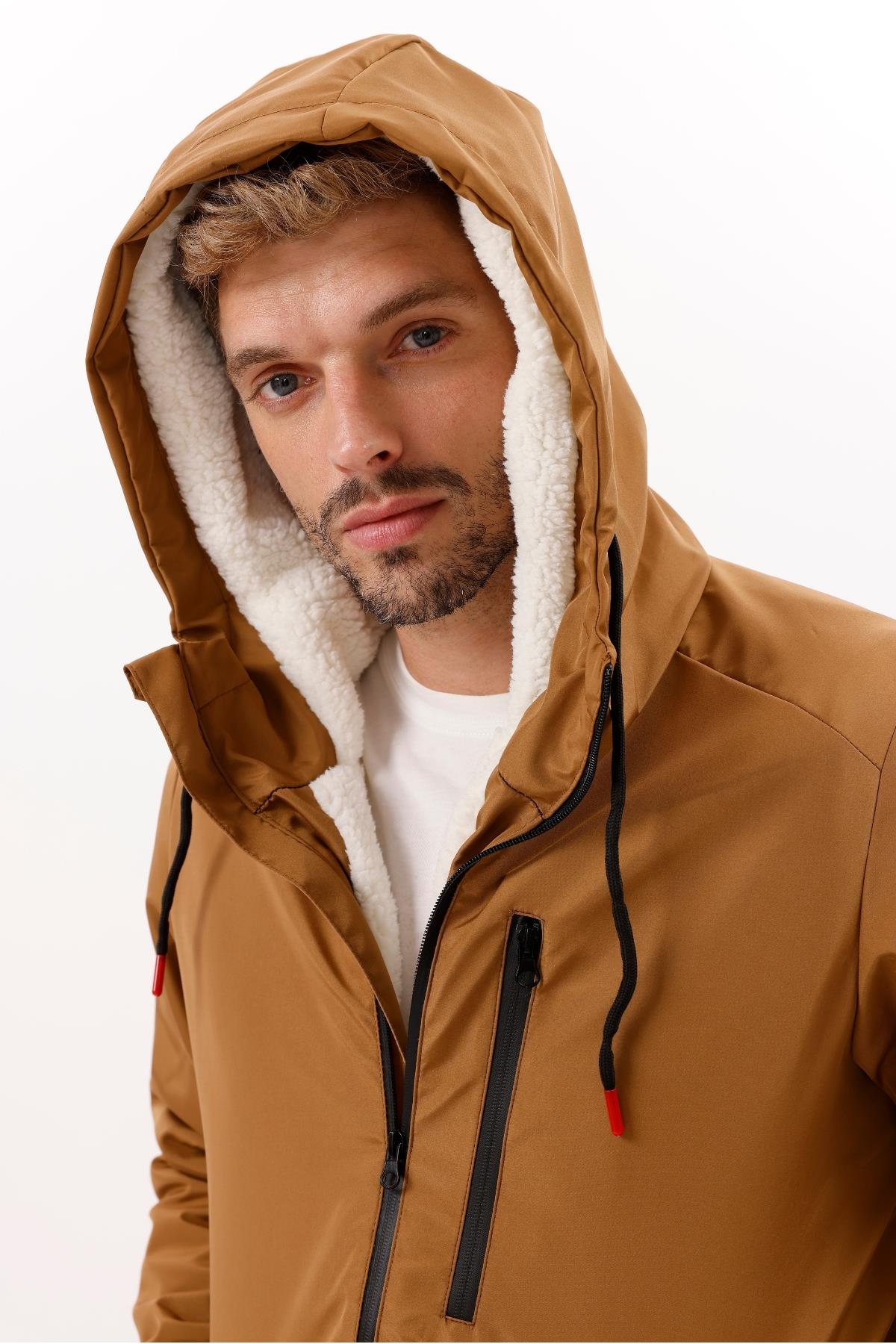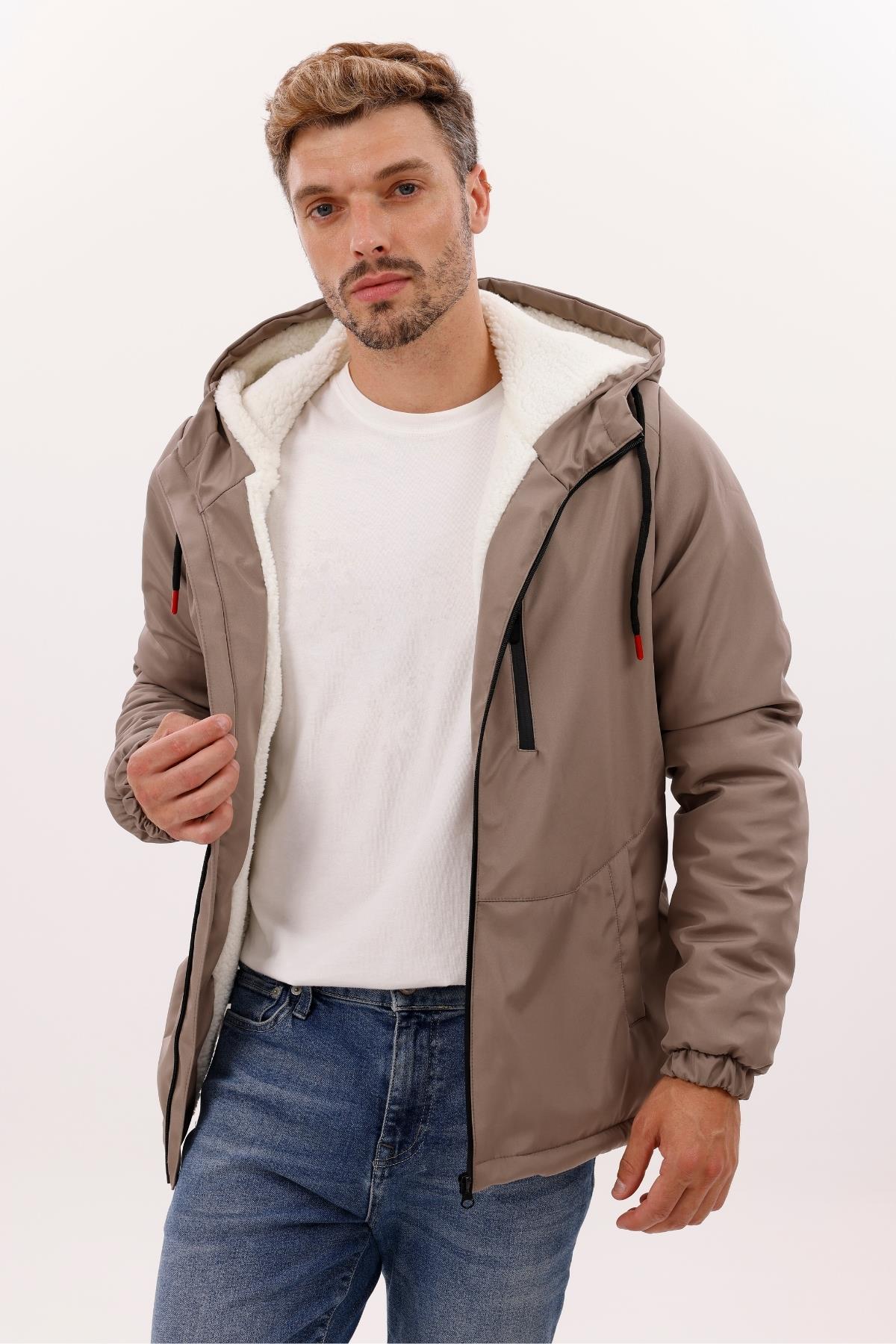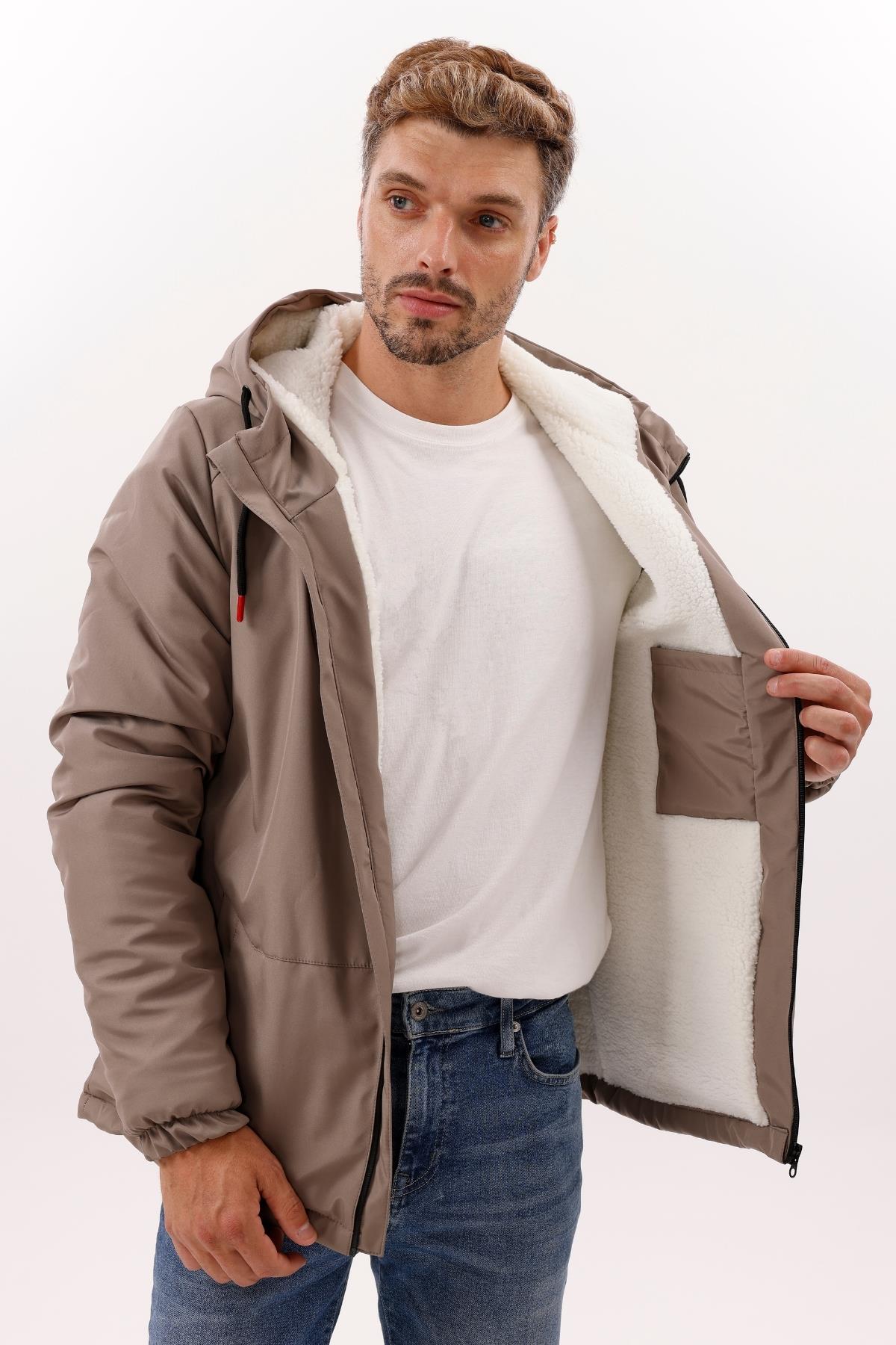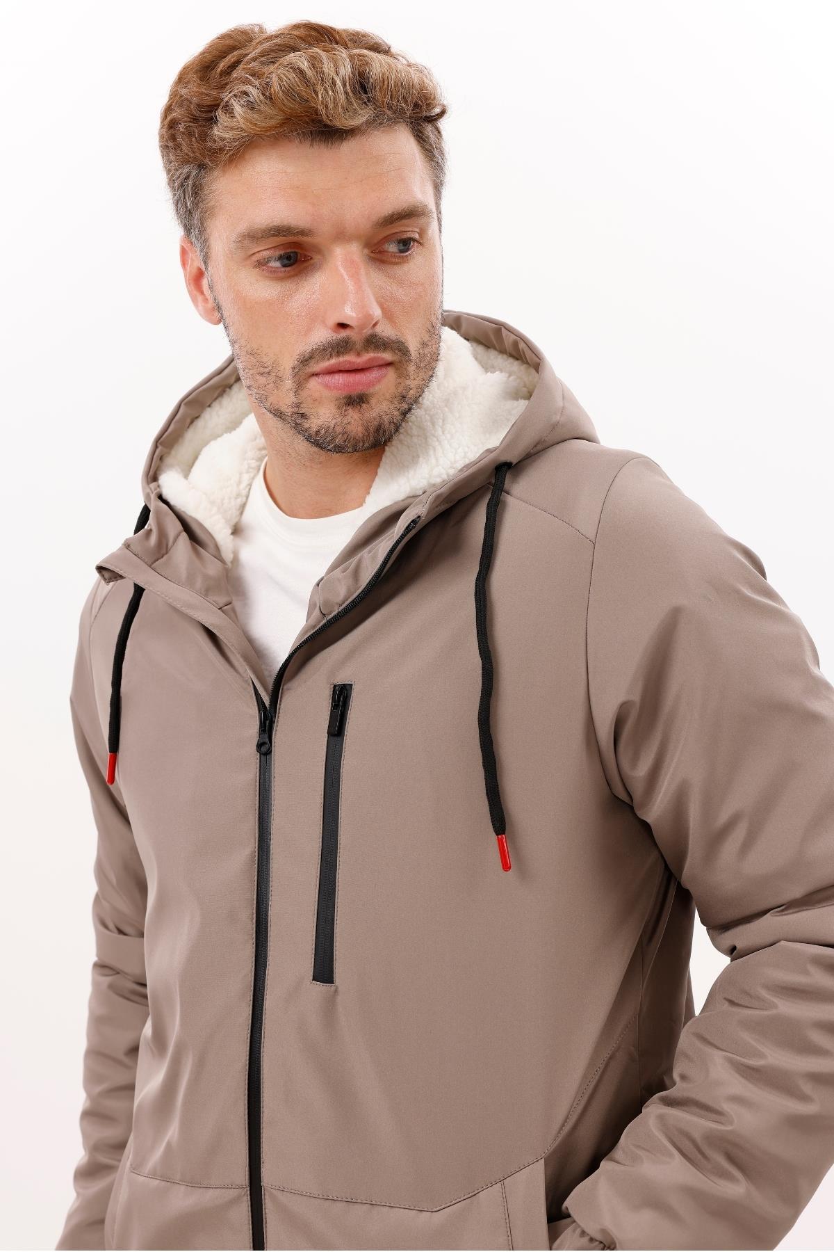 Erkek Kürklü Su Ve Rüzgar Geçirmez Kapüşonlu Kışlık Mont & Kaban & Parka (FMM-100 Vizon)