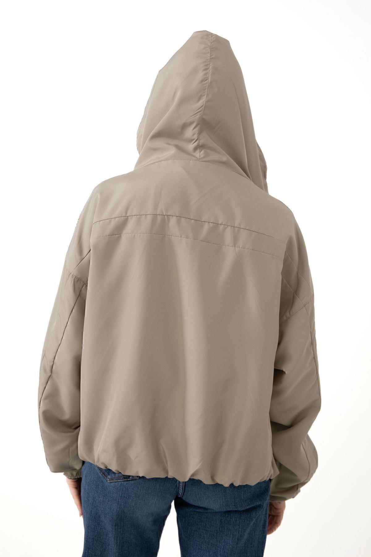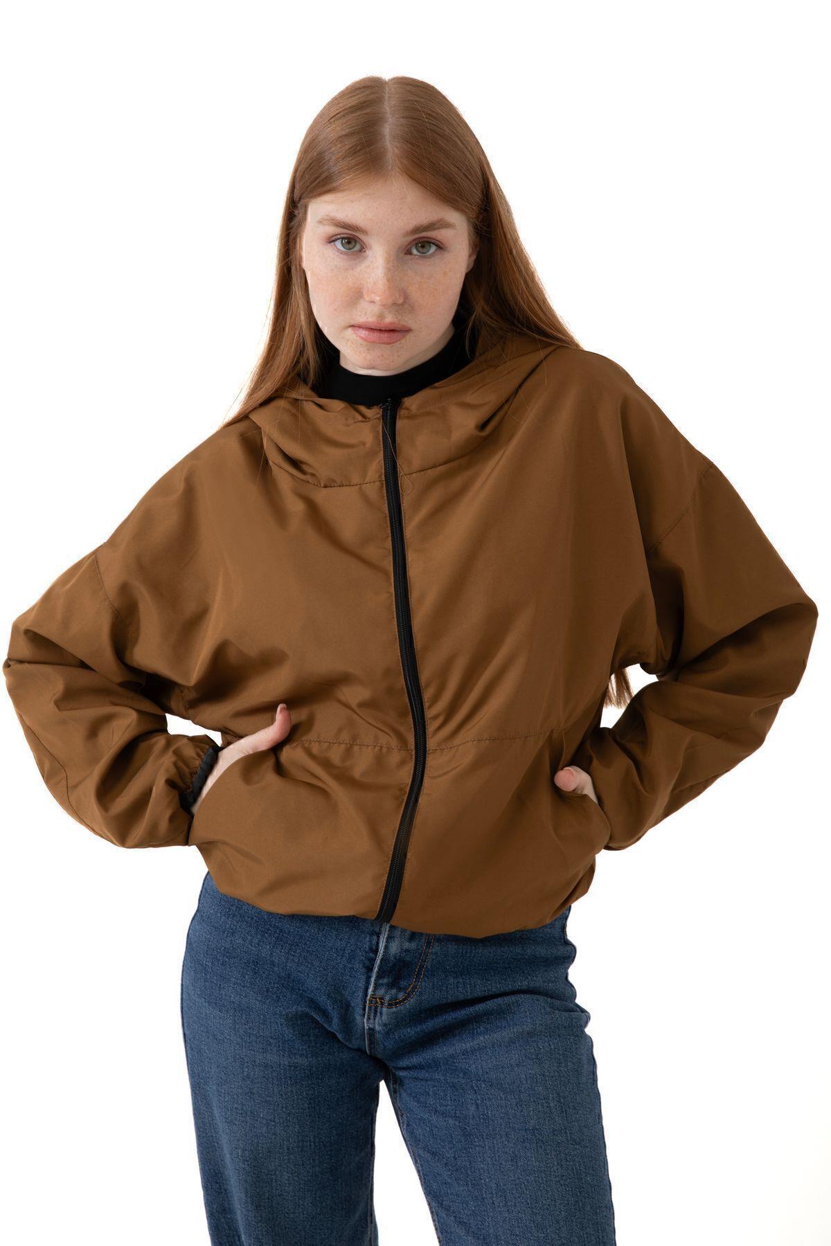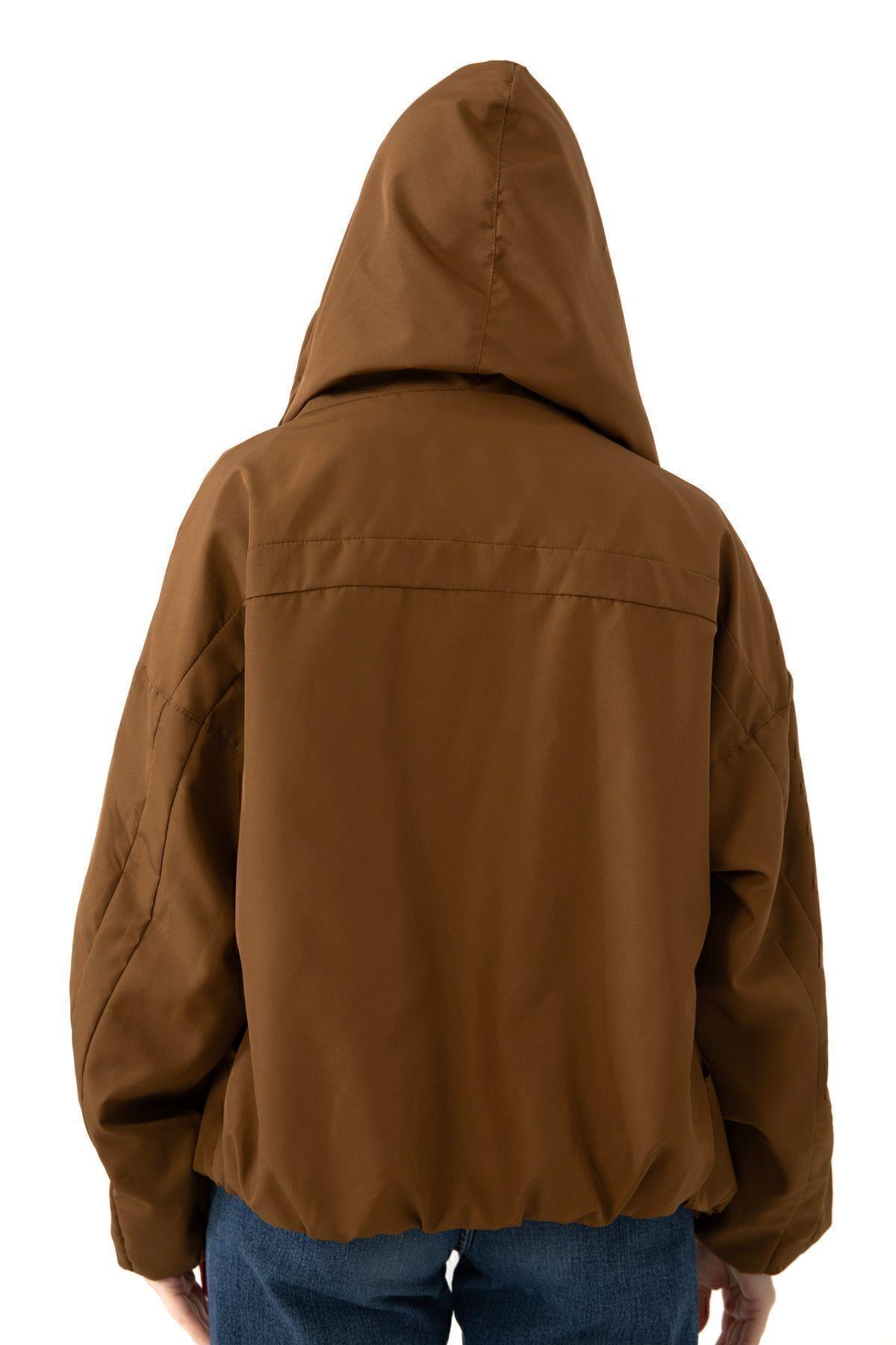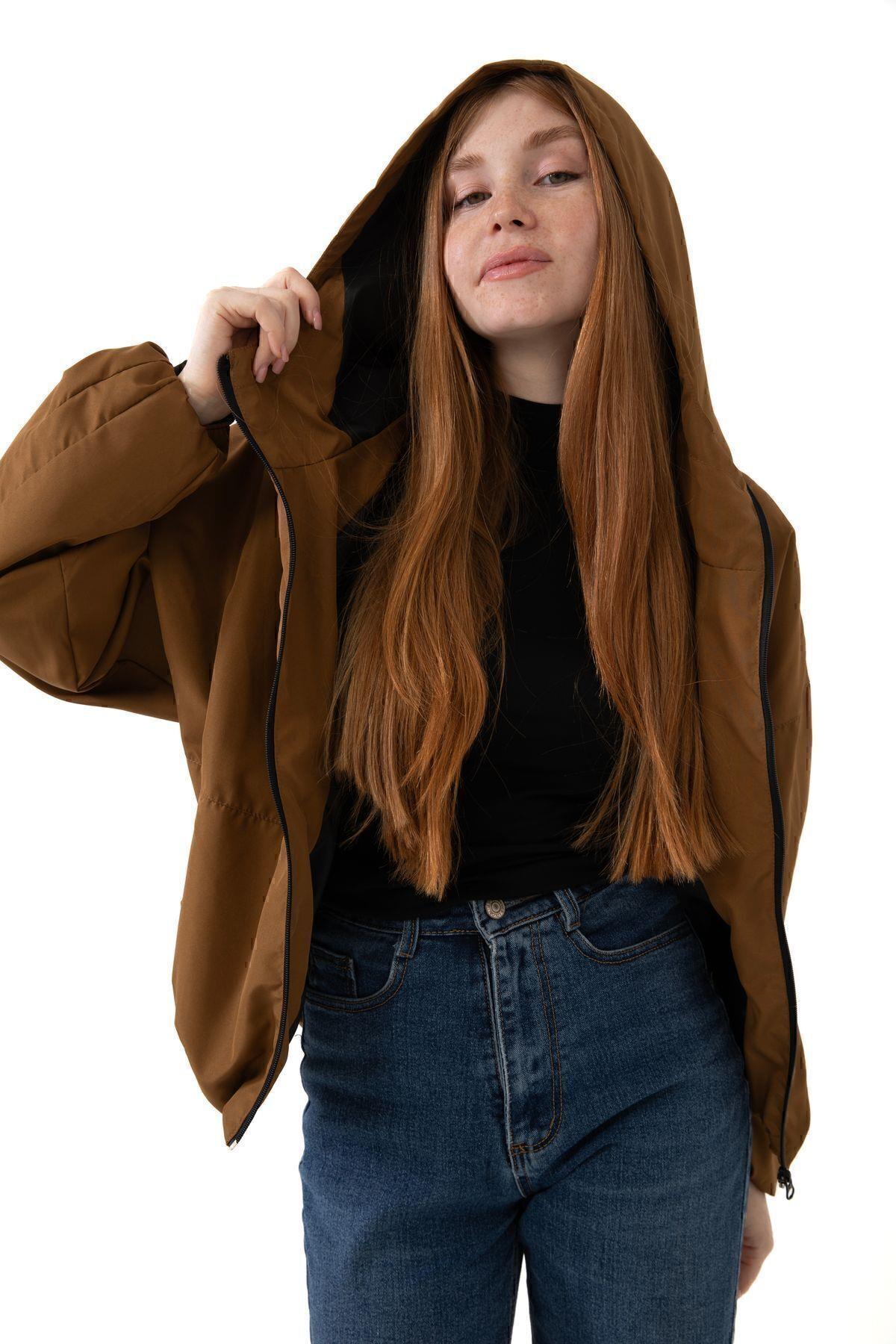 Spor Kadın Kapüşonlu Su ve Rüzgar Geçirmez Cepli İçi Astarlı Oversize Mevsimlik Yağmurluk (S-Y-20 Taba)