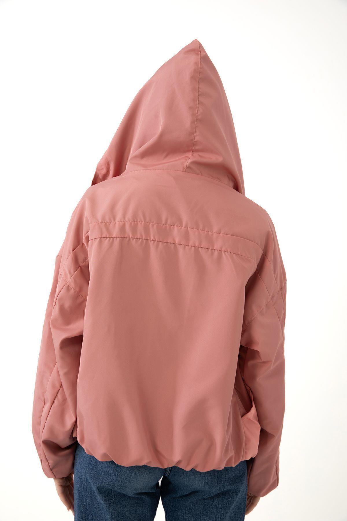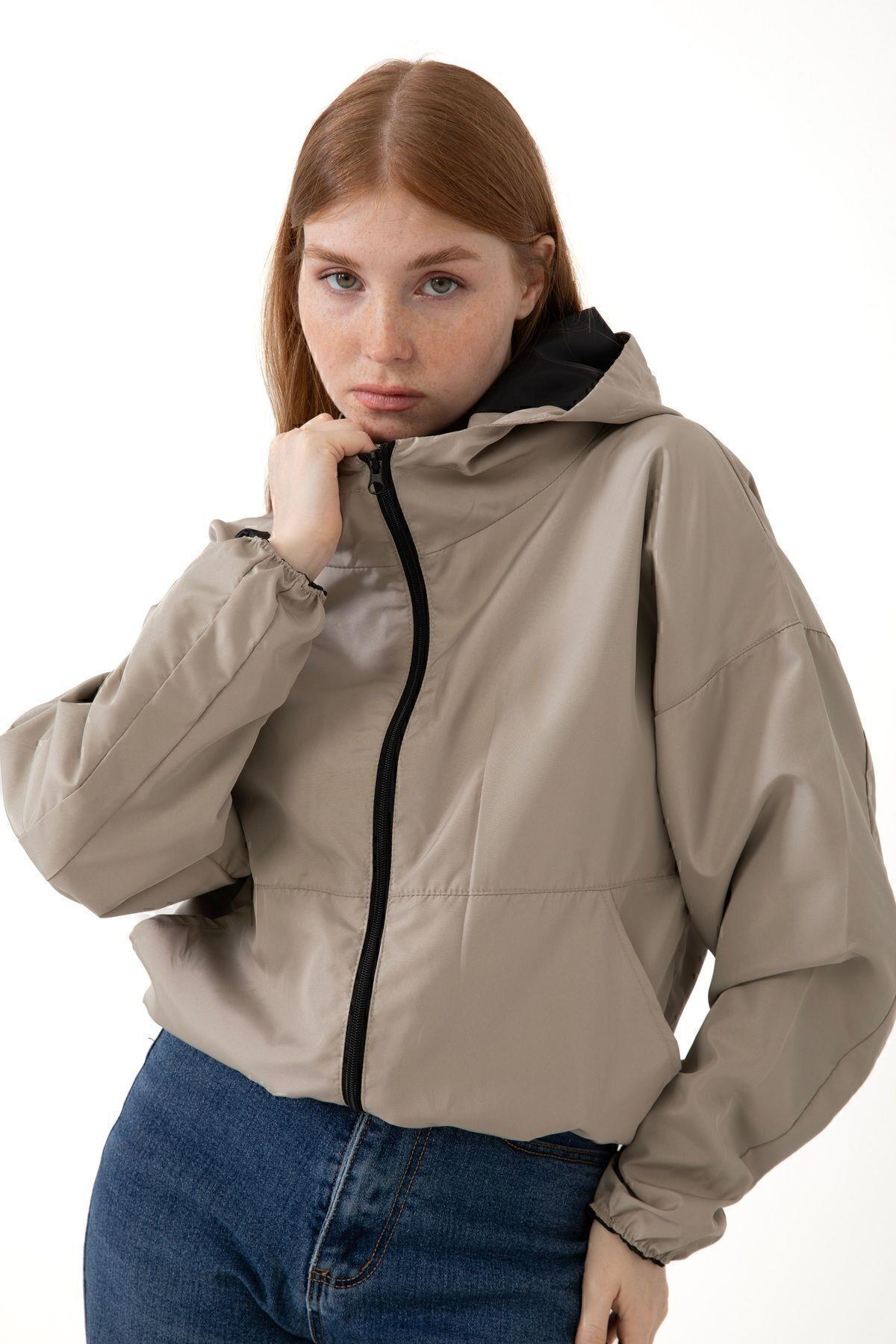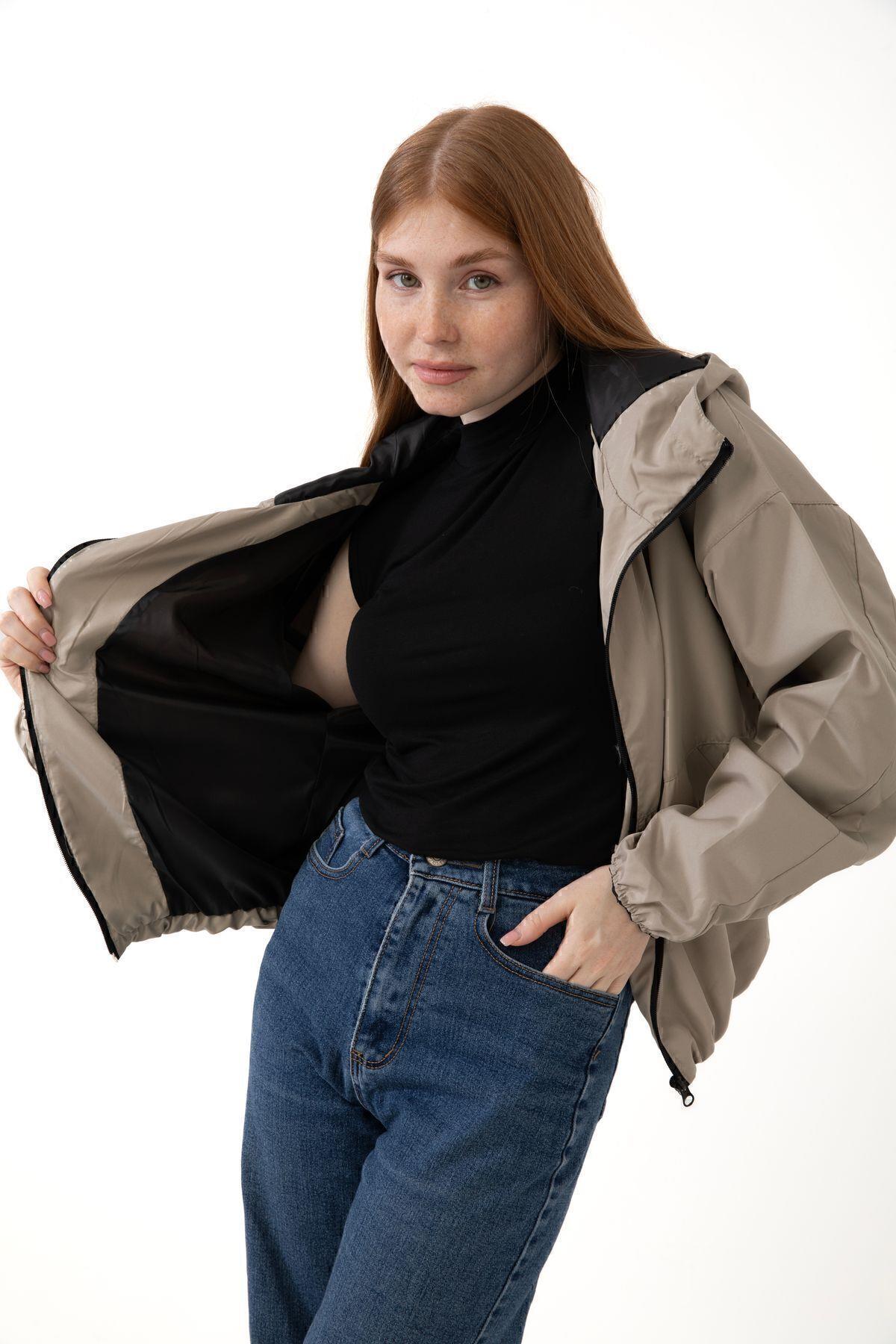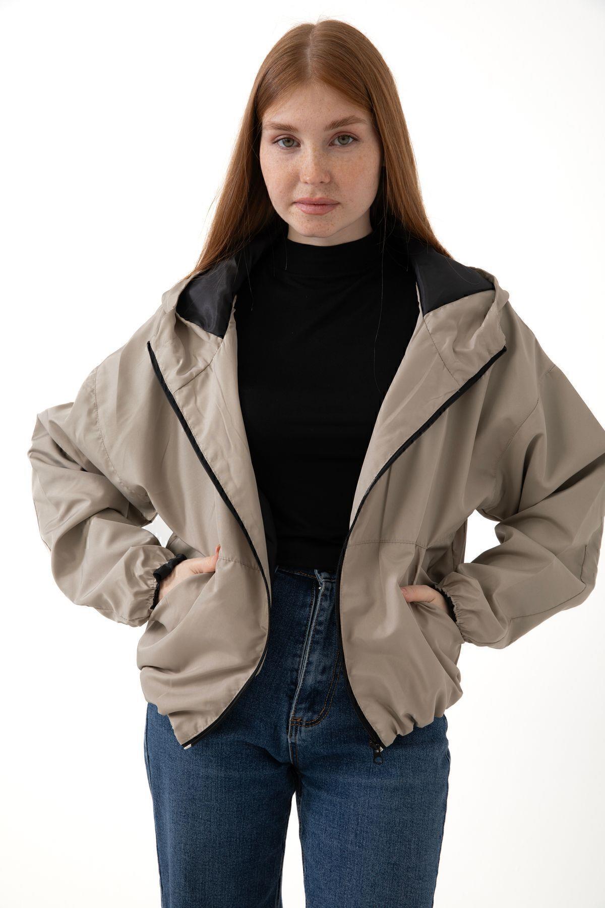 Spor Kadın Kapüşonlu Su ve Rüzgar Geçirmez Cepli İçi Astarlı Oversize Mevsimlik Yağmurluk (S-Y-20 Taba)