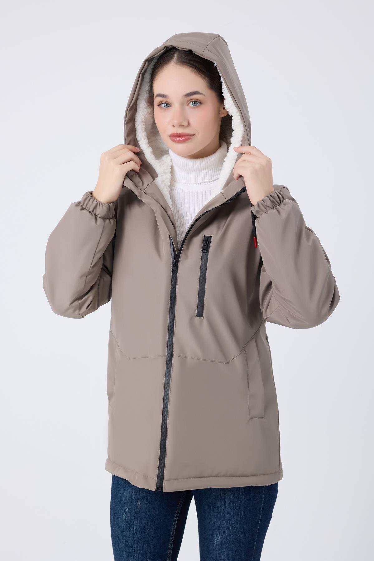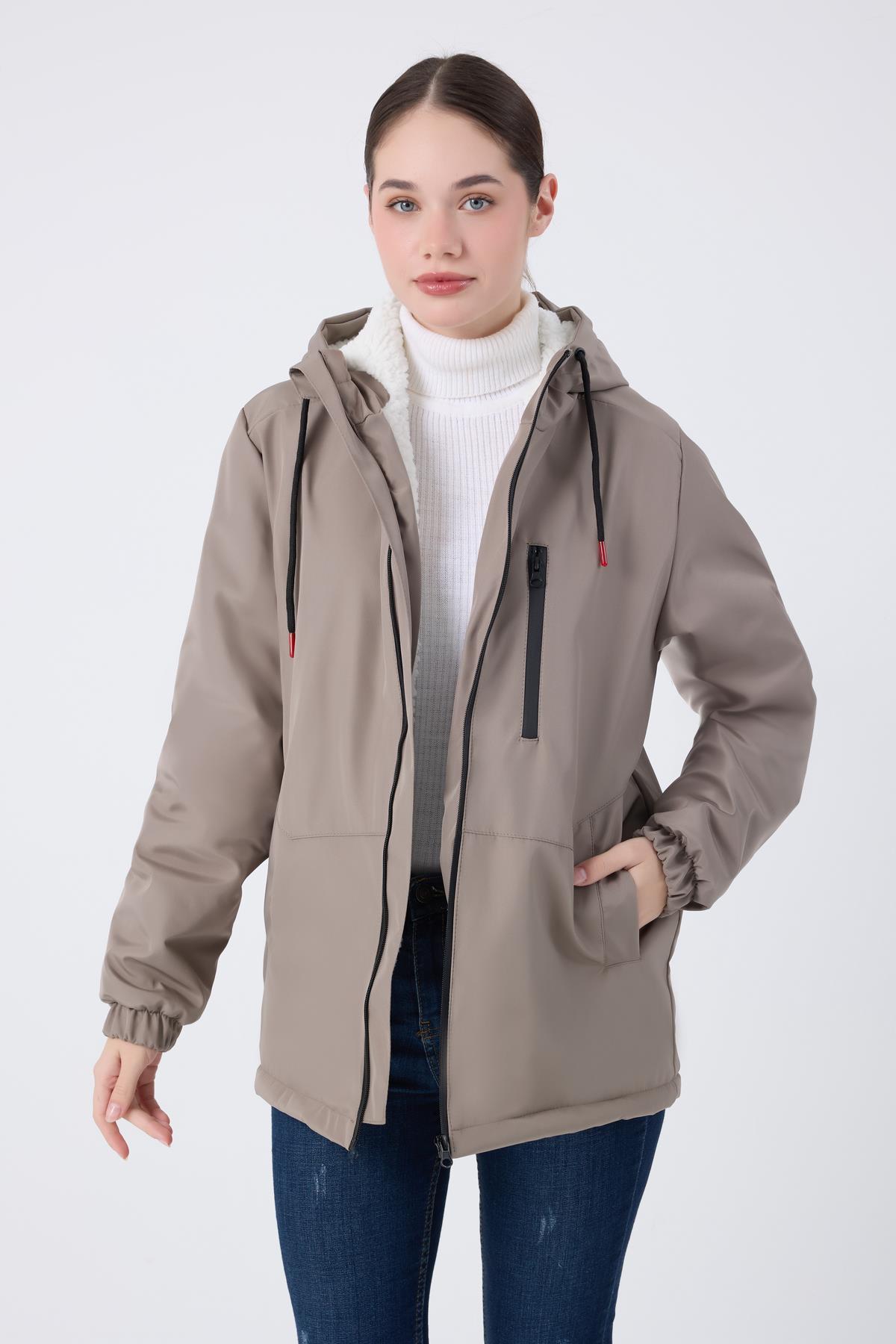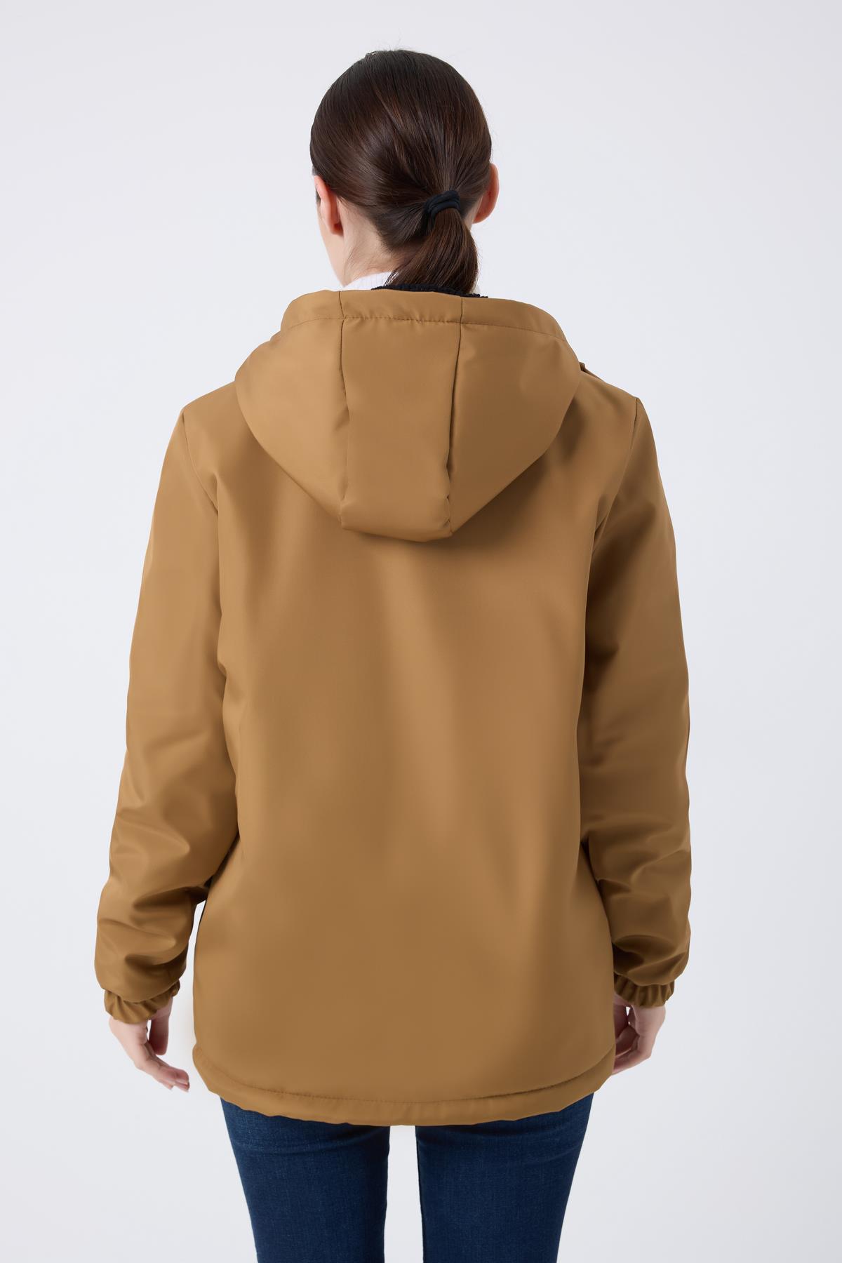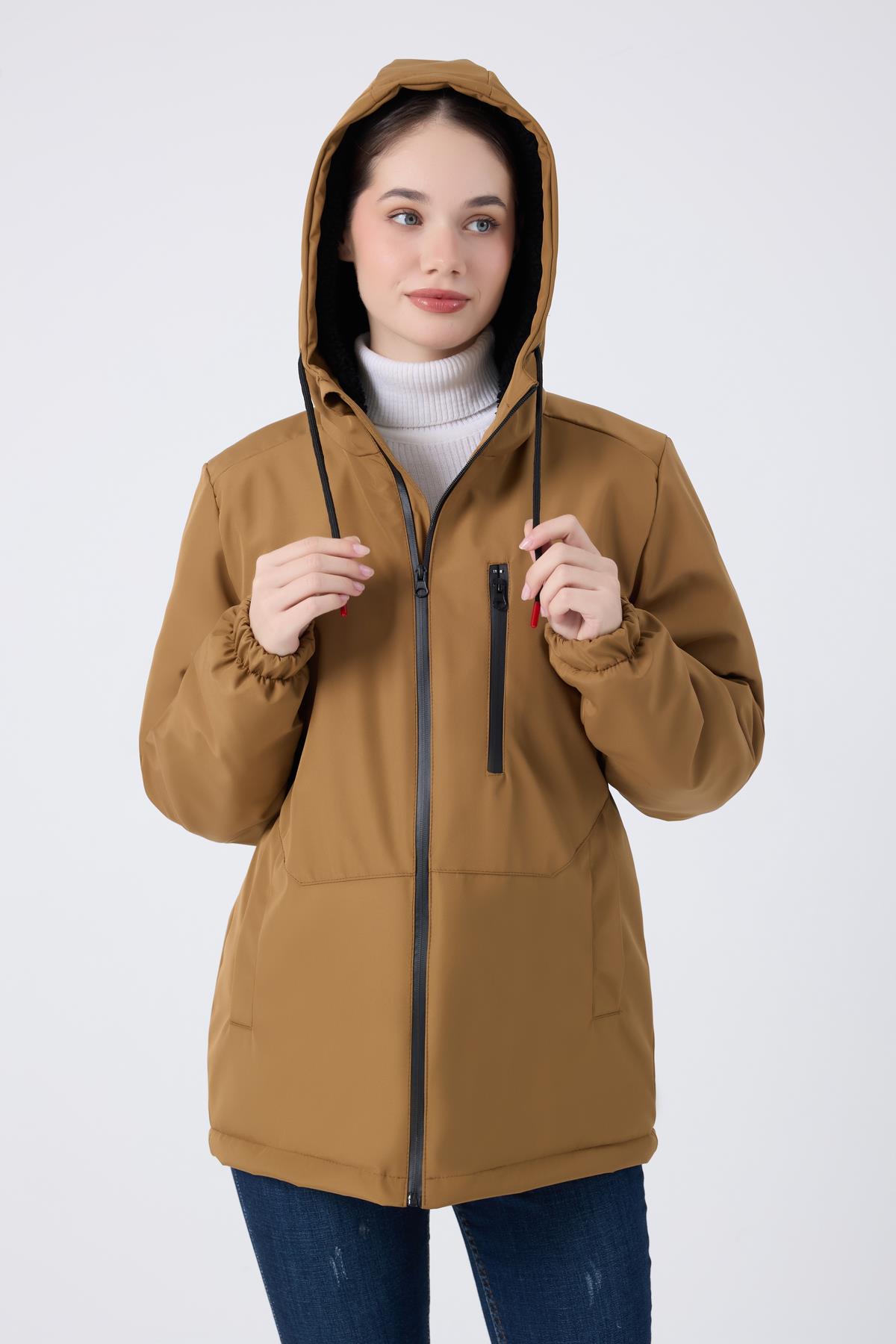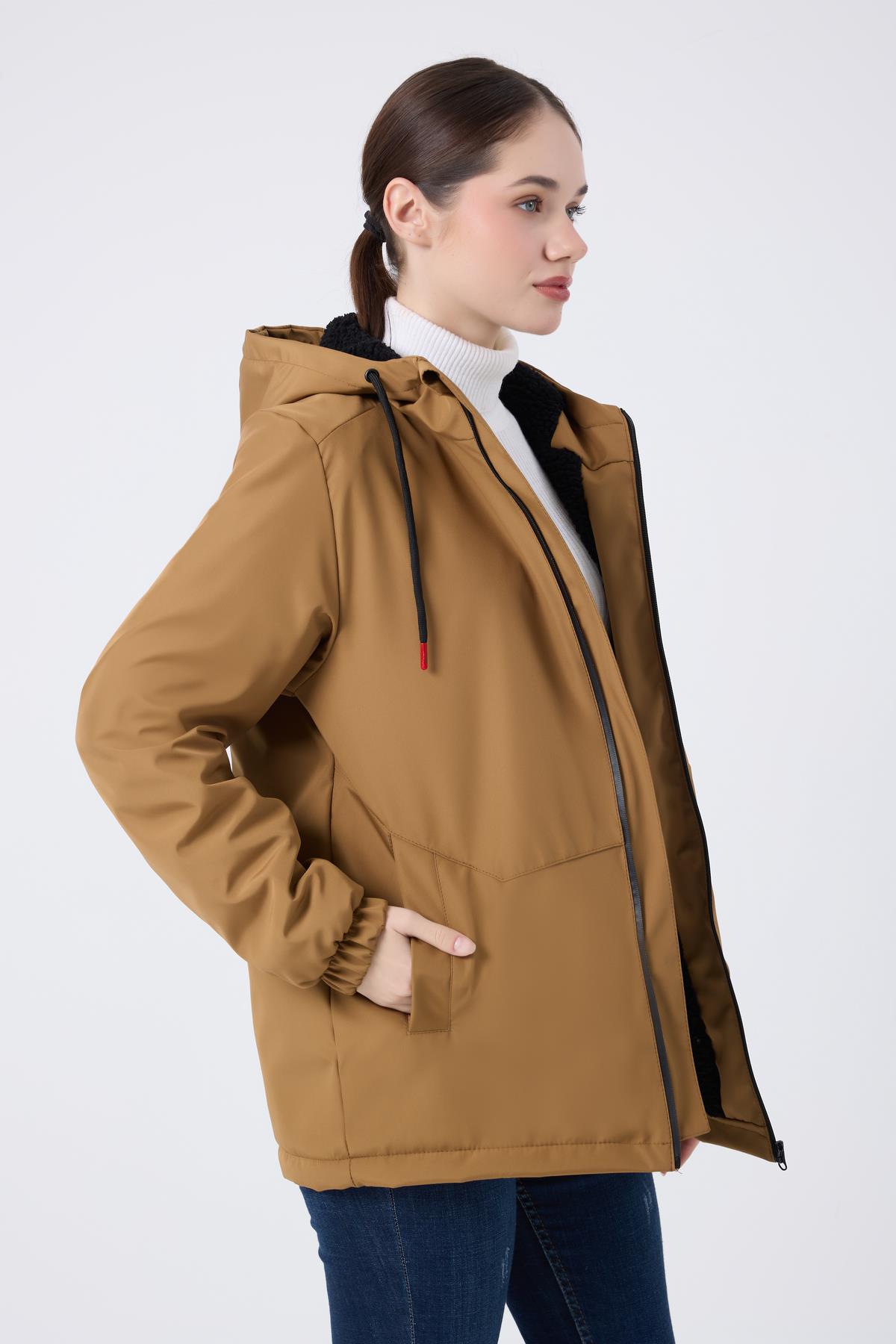 Spor Kadın Kürklü Su Ve Rüzgar Geçirmez Kapüşonlu Mont & Kaban & Parka (S-FMM-100-K Taba)