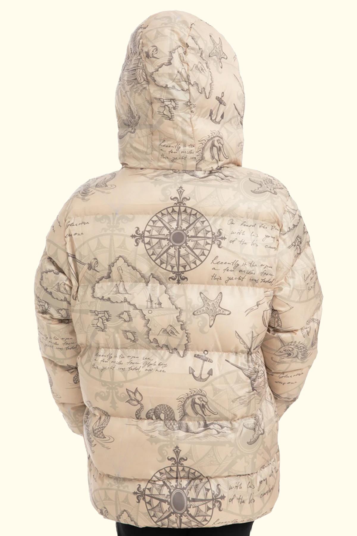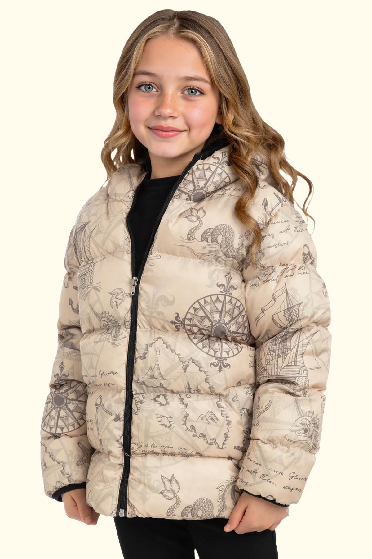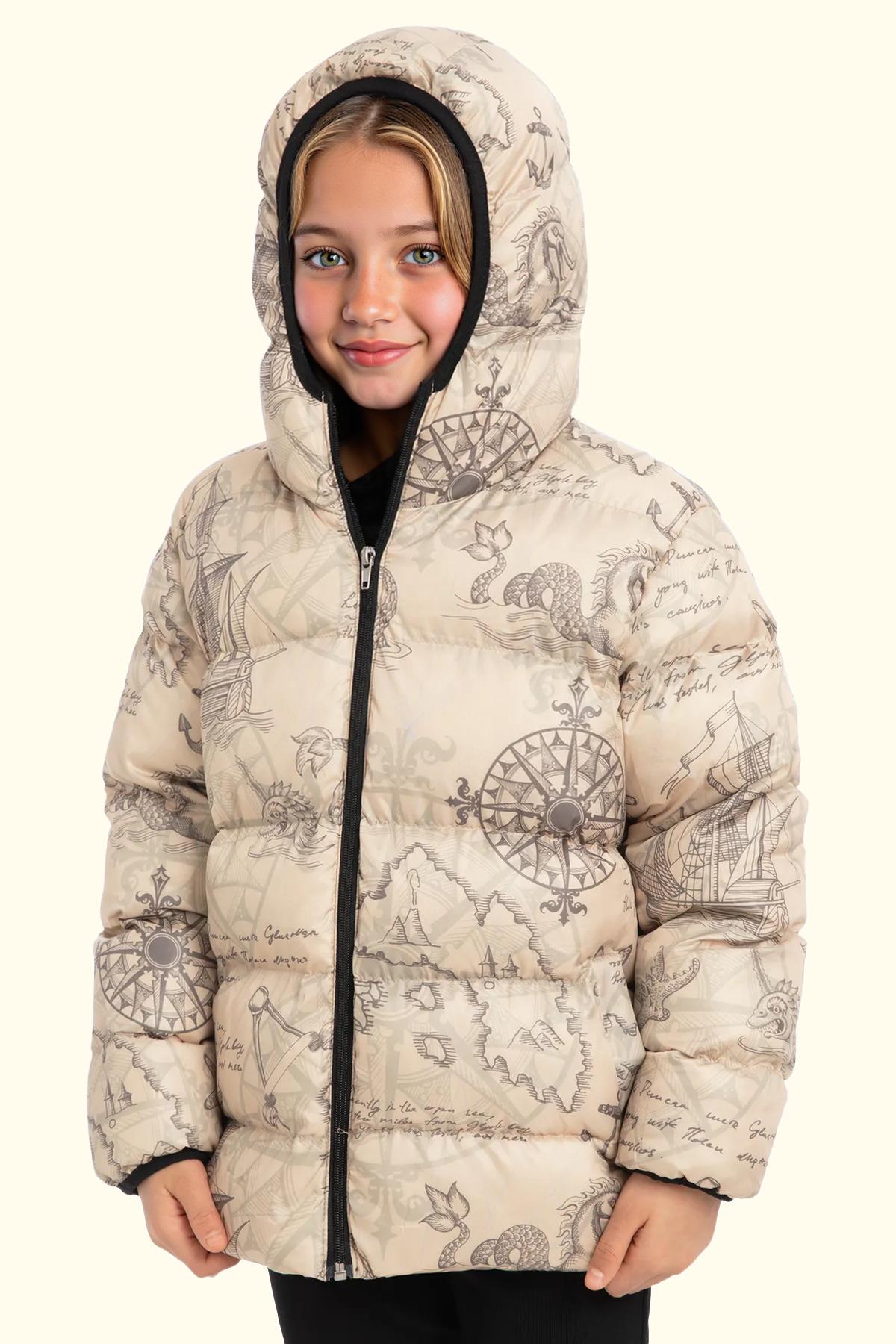 Spor Kız Çocuk Pusula Desen Polar Su Ve Rüzgar Geçirmez Kapüşonlu Cepli Mont (S-CD-4-K Bej-Pusula)