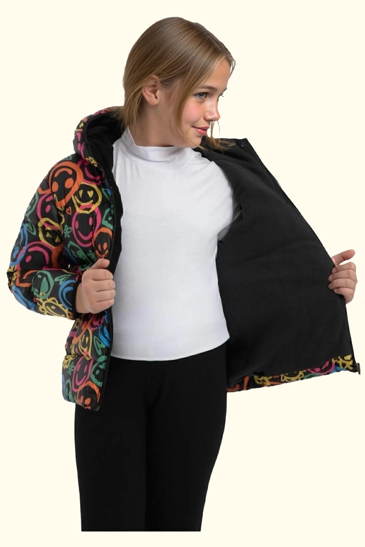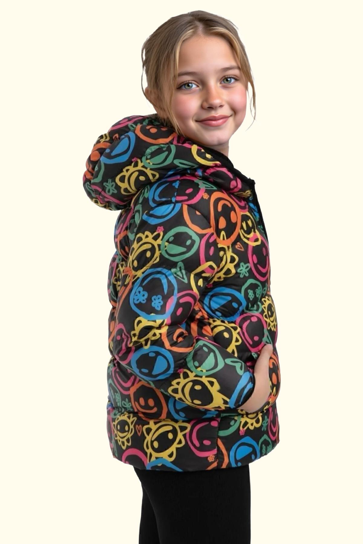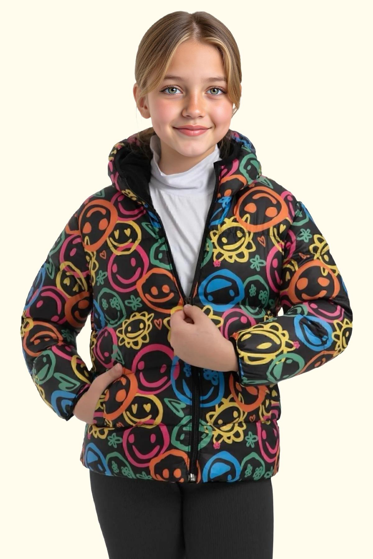 Spor Kız Çocuk Gülen Emoji Polarlı Kürklü Su Ve Rüzgar Geçirmez Kapüşonlu Cepli Mont (S-Emoji-K 2024)