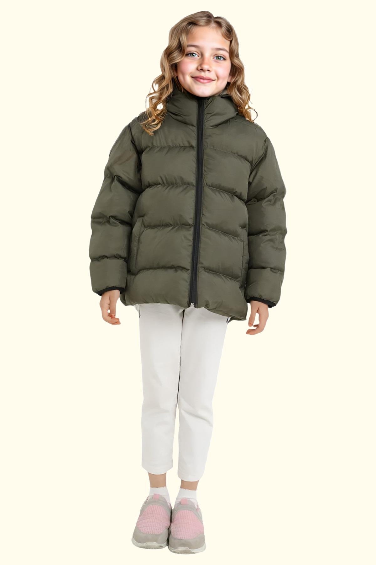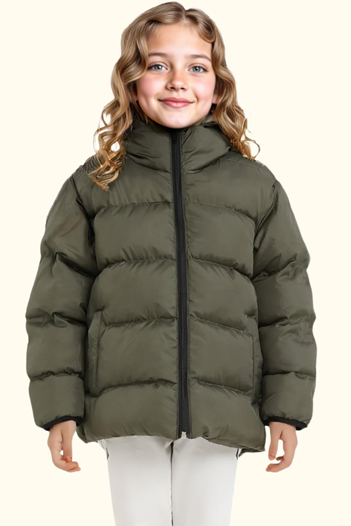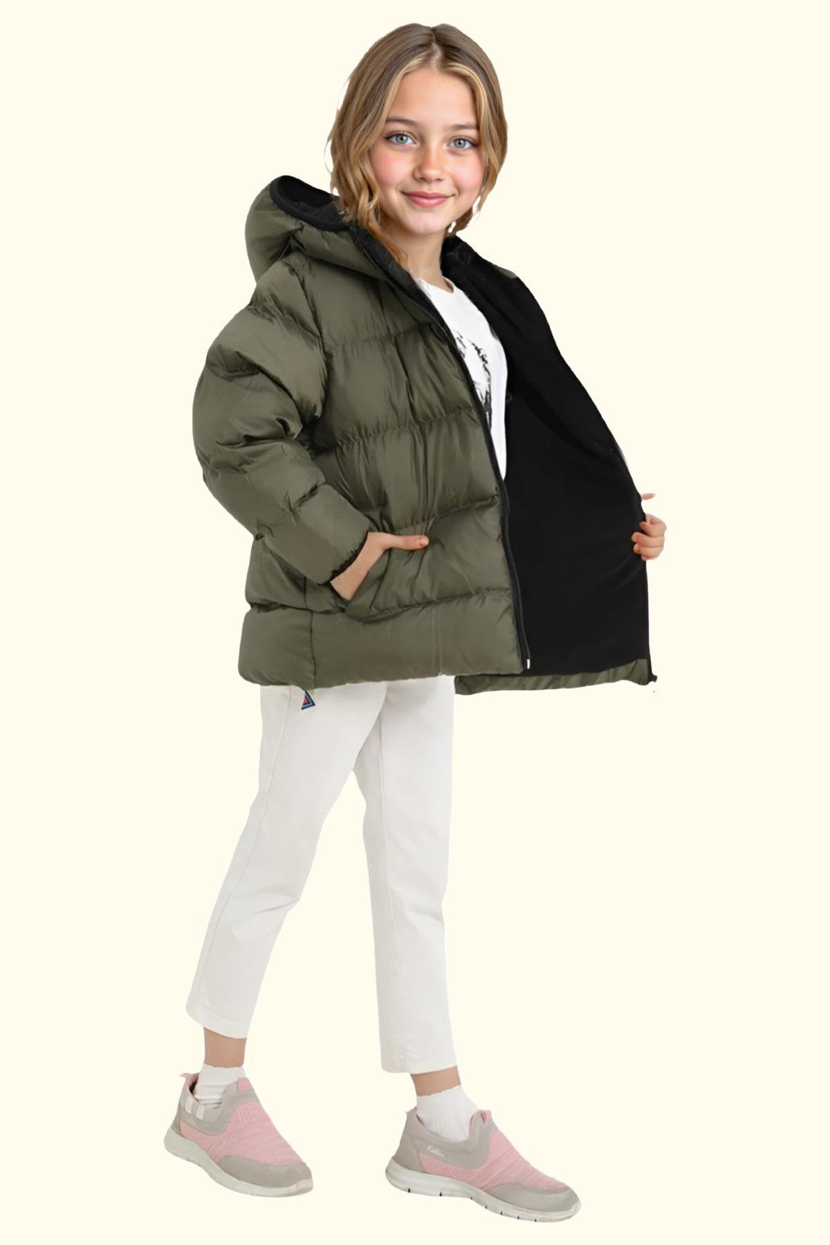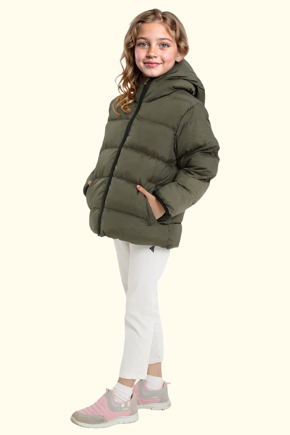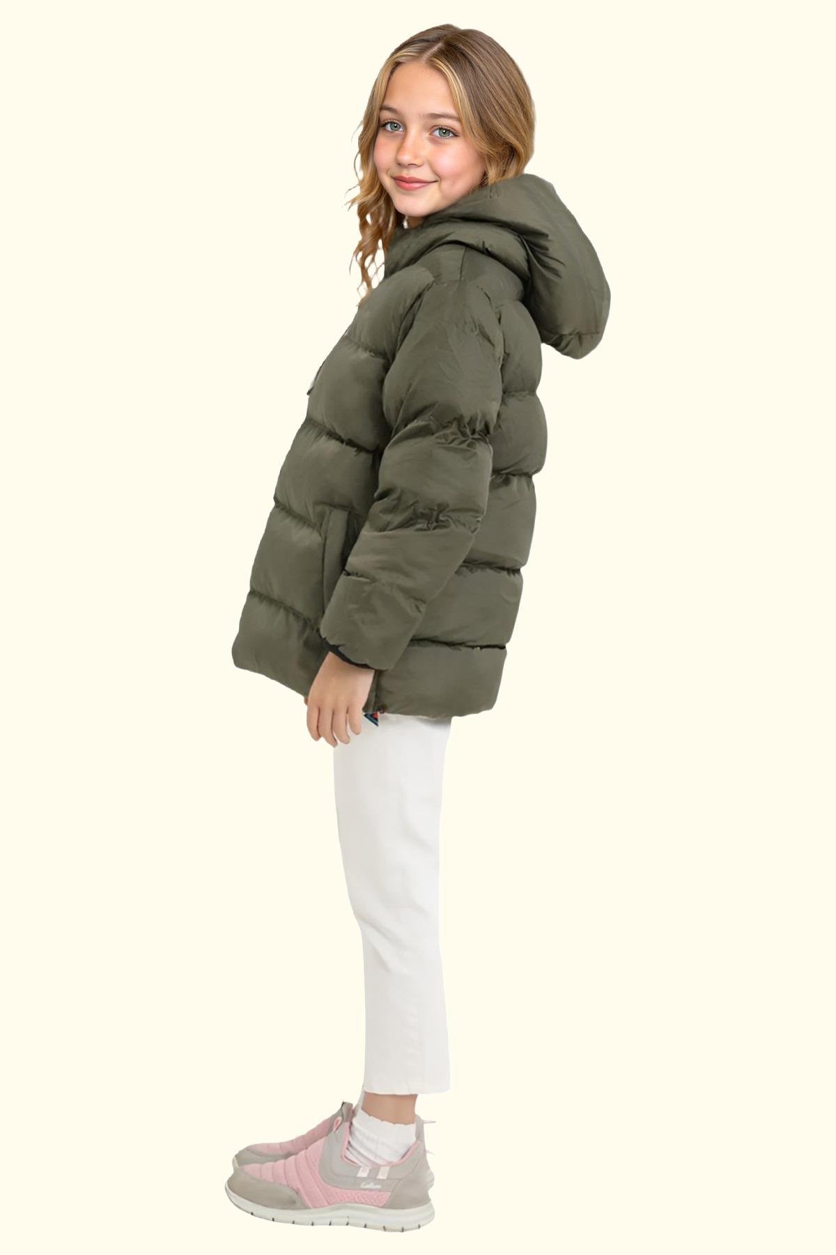 Spor Kız Çocuk Polarlı Kürklü Kapüşonlu Su Geçirmez Rüzgara Dayanıklı Cepli Mont (S-S-4-Haki)
