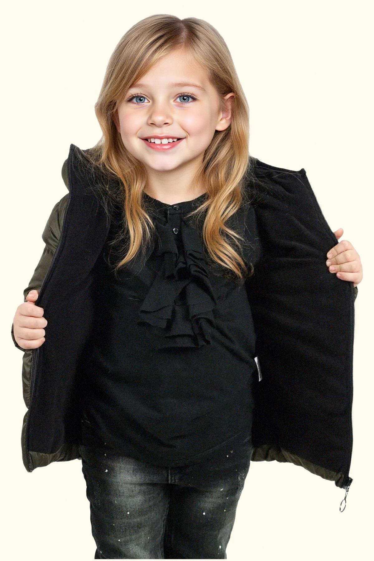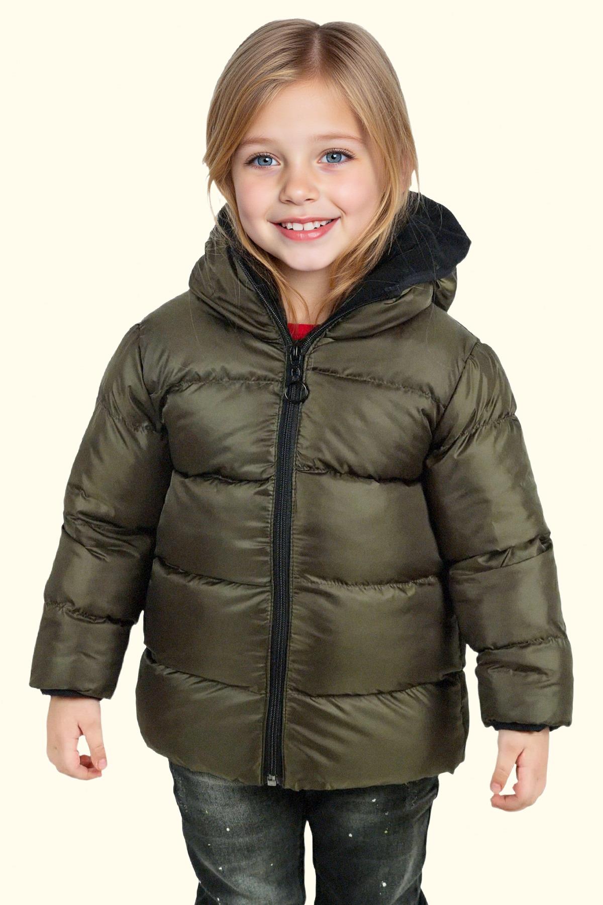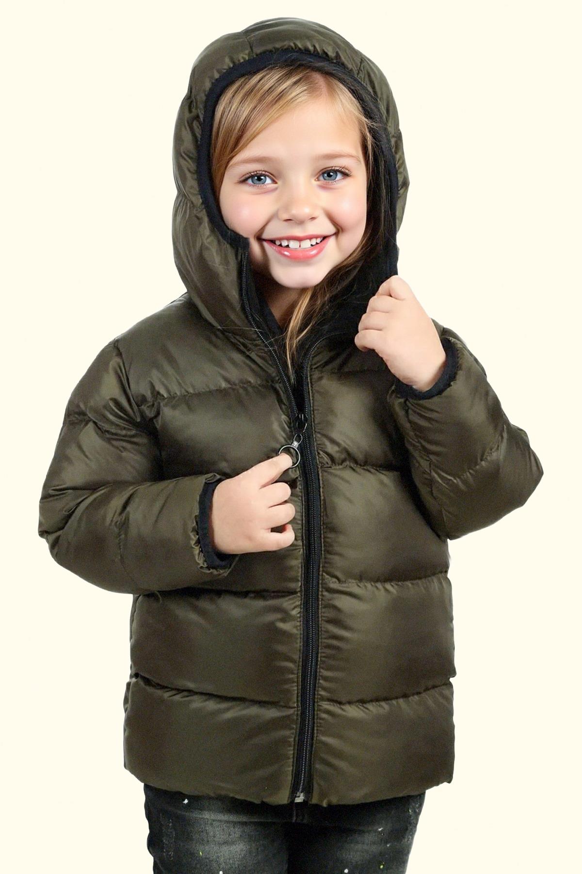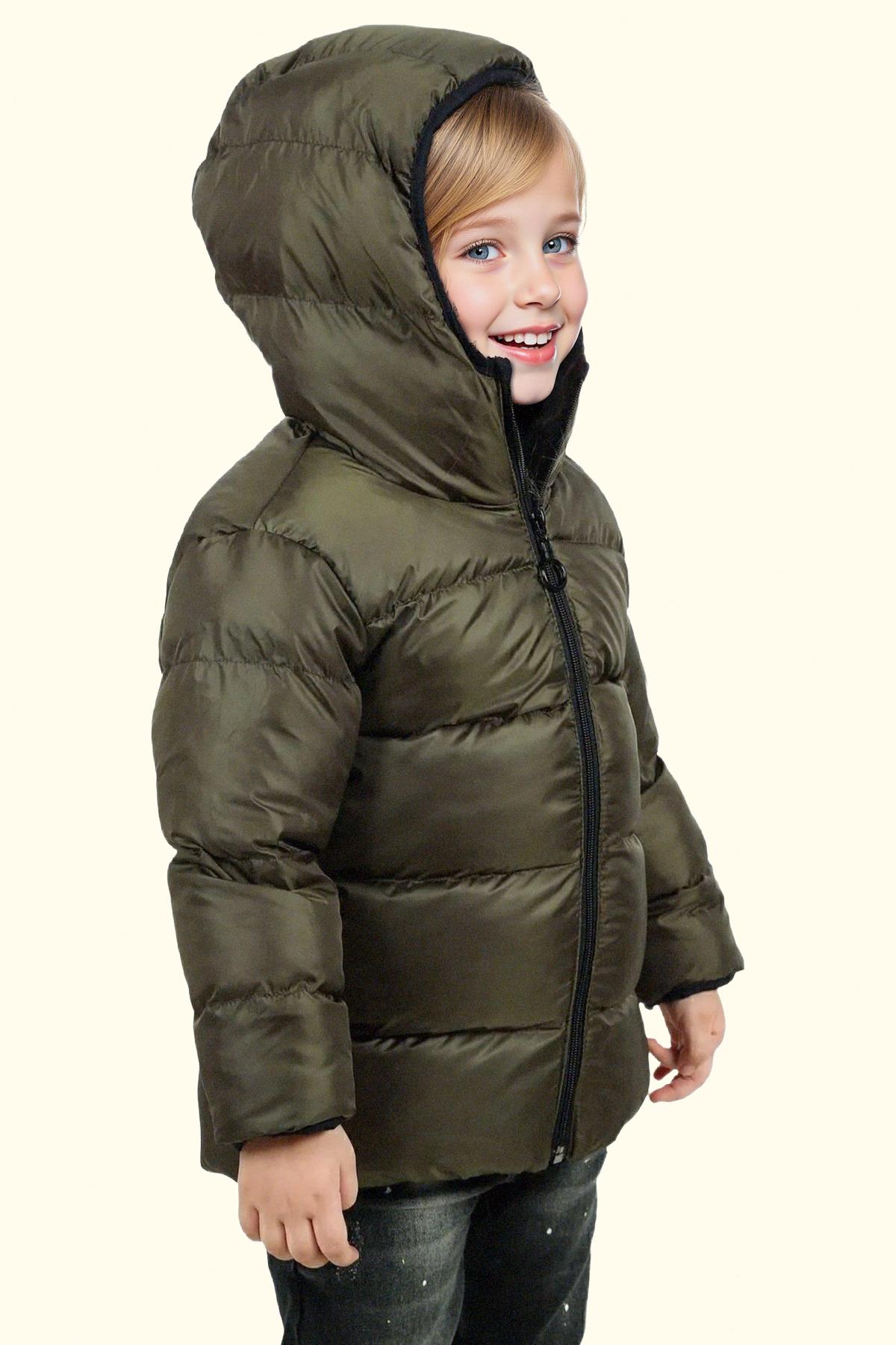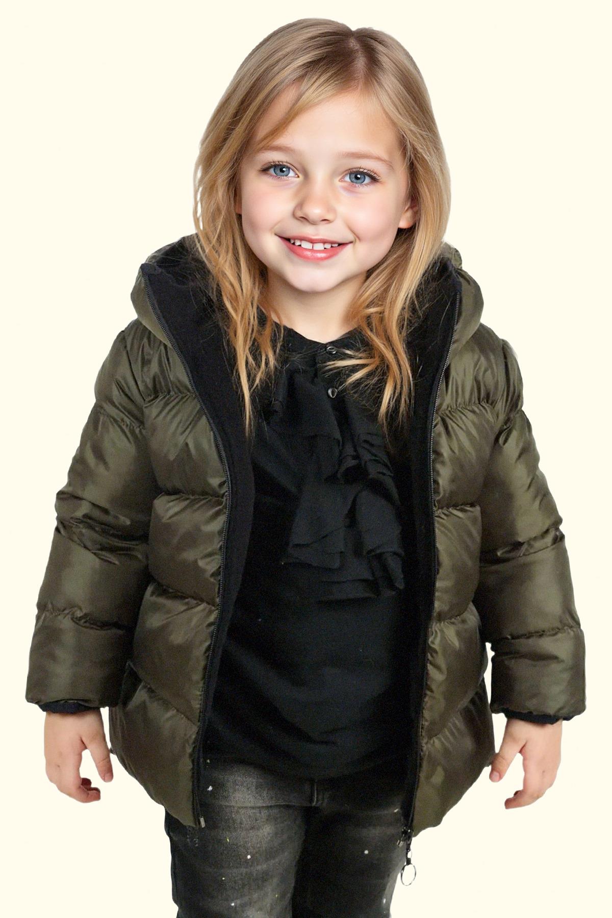 Kız Çocuk Polarlı Kürklü Kapüşonlu Su Geçirmez Rüzgara Dayanıklı Şişme Kışlık Mont Kaban (FS-3-K Haki)